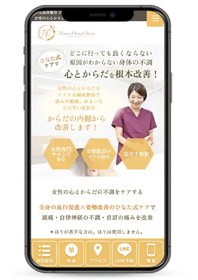 スマホでは、一番下にいつも施術メニューやお問い合わせなどのボタンが表示されていますので、必要な時にすぐアクセスしていただくことができます。